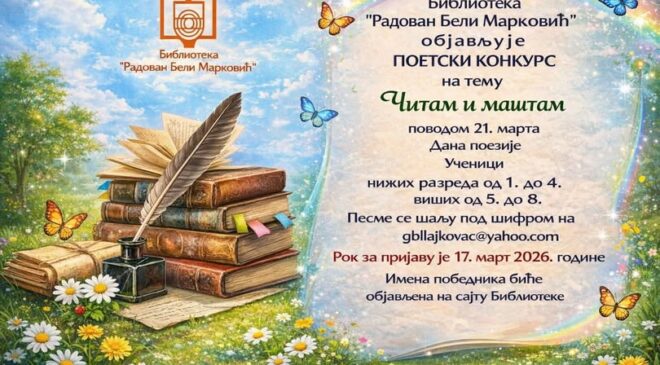 Povodom Dana poezije, 21. marta, Biblioteka “Radovan Beli Marković” Lajkovac objavljuje Poetski konkurs za osnovce na temu “Čitam i maštam”. Učesnici konkursa (osnovci nižih i viših razreda) treba radove da pošalju pod šifrom, na gbllajkovac@yahoo.com Rok za prijavu je 17. mart. Imena pobednika biće objavljeni na sajtu biblioteke.