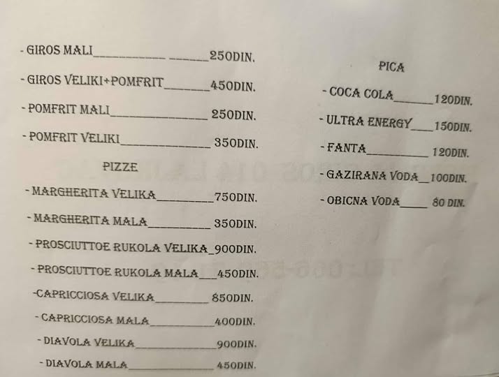 Pored girosa, u ponudi su pomfrit, pizze, slane i slatke palačinke, kao i pića. Sve cene su vrlo pristupačne.