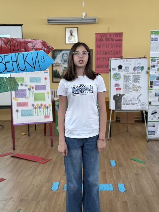 Svečani čas obeležio je i poetski trenutak – predstavljanje pesme „Evropa govori“, koju je napisala učenica Sara Milivojević (8/3), članica literarne sekcije „Raspevano pero“. NJeni stihovi odzvanjali su kao poruka da jezici nisu prepreka, već krila koja spajaju ljude.