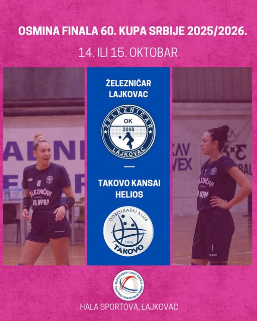 U prostorijama Odbojkaškog saveza Srbije obavljen je žreb u obe konkurencije, osmine finala jubilarnog, 60. Kupa Srbije 2025/2026. u konkurenciji odbojkašica i 61. Kupa Srbije 2025/2026. u konkurenciji odbojkaša. Utakmice u konkurenciji odbojkašica odigraće se 14. i 15. oktobra, a u konkurenciji odbojkaša 21. i 22. oktobra. Žrebom je rukovodio Danilo Mrđa, direktor takmičenja OSS. U osmini finala 60. Kupa Srbije 2025/2026. sredinom oktobra u Lajkovcu igraće ŽELEZNIČAR (LAJKOVAC) – TAKOVO KANSAI HELIOS (GORNJI MILANOVAC)! “Žreb u prostorijama Odbojkaškog saveza Srbije odredio je našeg rivala – ekipu Takova! Naše Dizelke…