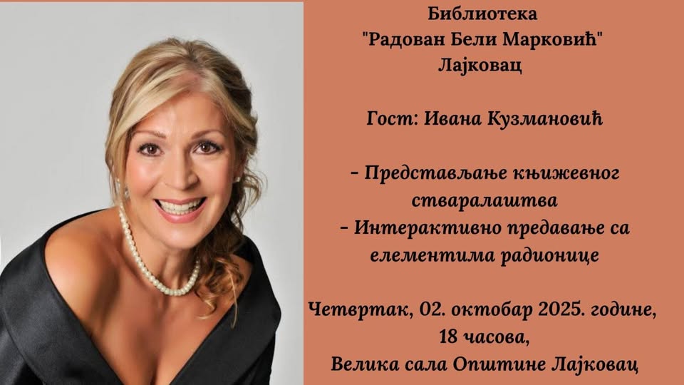 Biblioteka „Radovan Beli Marković“ u četvrtak 2. oktobra od 18 časova u Gradskoj kući organizuje gostovanje u Lajkovcu izuzetno popularne Ivane Kuzmanović, koja će pored predstavljanja književnog stvaralaštva u svom prepoznatljivom stilu održati i interaktivno predavanje sa elementima radionice. Ivana Kuzmanović (Beograd,1966) srpska je književnica, lajf kouč i nekadašnja pevačica. Članica je Udruženja književnika Srbije, kao i dobitnica priznanja Zlatni Hit Liber za 2011. godinu, koje dodeljuje RTS. Pokretač je i voditelj Susreta pomerisrca – razgovori o ljubavi, međunarodno akreditovani EMCC Life Coach i mentor, osnivač i izvršni direktor udruženja…