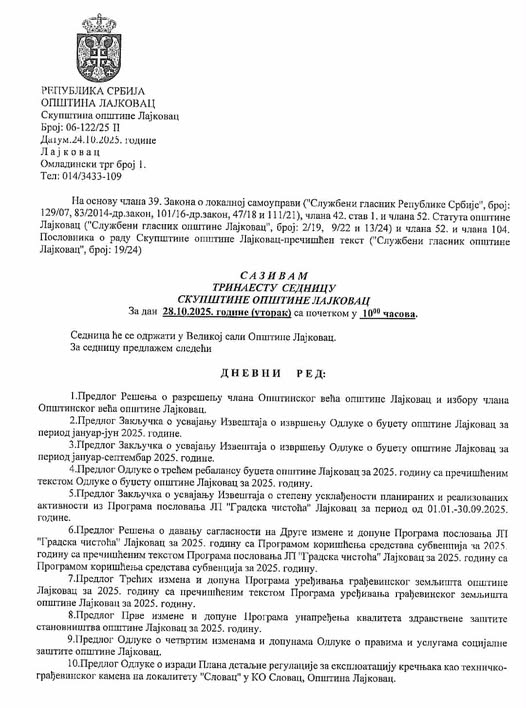 Sednica Skupštine opštine Lajkovac, trinaesta po redu u aktuelnom sazivu, zakazana je za utorak 28. oktobar, sa početkom u 10 časova.