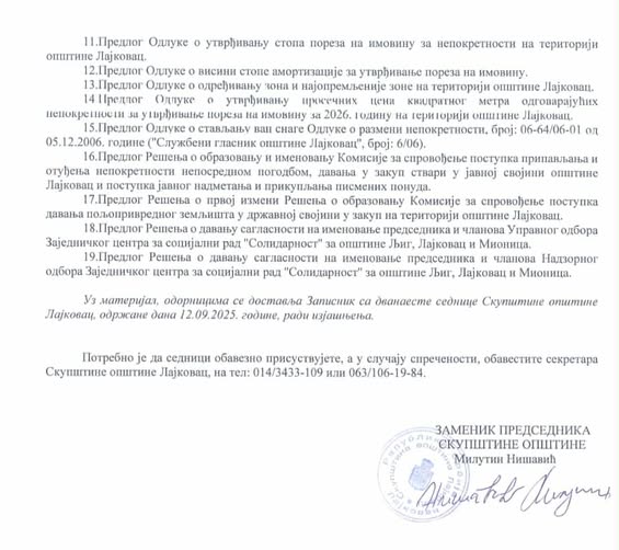 Na dnevnom redu je i paket odluka po osnovu kojih se puni budžet: Odluke o utvrđivanju stopa poreza na imovinu za nepokretnosti na teritoriji opštine Lajkovac, Odluke o visini stope amortizacije za utvrđivanje poreza na imovinu, Odluke o određivanju zona i najopremljenije zone na teritoriji opštine Lajkovac i Odluke o utvrđivanju prosečnih cena kvadratnog metra odgovarajućih nepokretnosti za utvrđivanje poreza na imovinu za 2026. godinu na teritoriji opštine Lajkovac.