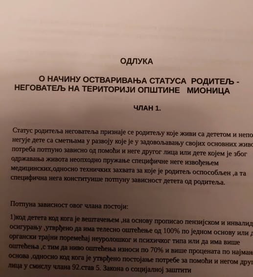 Reč je o predlogu zakona koji bi regulisao prava i status roditelja koja se brinu o deci sa smetnjama u razvoju. Za regulisanje statusa roditelj-negovatelj na nivou države neophodne su izmene Zakona o socijalnoj zaštiti, koje za sada nisu prošle neophodnu skupštinsku proceduru.
