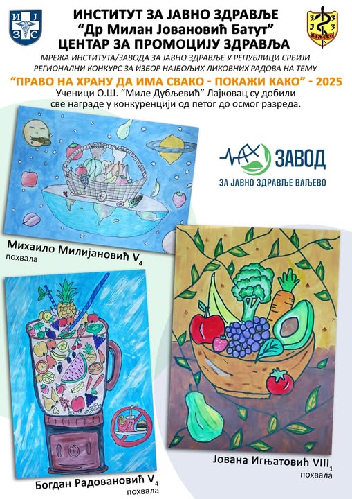 Učenici OŠ „Mile Dubljević“ Lajkovac ponovo su i na drugom konkursu koji je organizovao Zavod za javno zdravlje Valjevo na području Kolubarskog okruga dobili sve nagrade u konkurenciji od petog do osmog razreda.