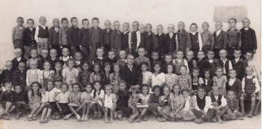 Foto: Generacija jabučkih đaka rođenih 1933. i 1934. godine sa učiteljem Markom. Fotografiju je napravio Vlada Popović, zv. Šuca 1943. godine koji je jedini u Jabučju imao fotoaparat u tom ratnom periodu i koji je ovekovečio mnoge događaje iz ratnih vremena u Jabučju .