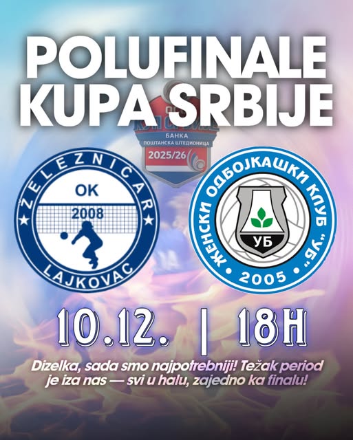 Prva poufinalna utakmica jubilarnog 60. Kupa Srbije 2025/2026. Između OK Železničar i ŽOK Ub odigraće se u sredu 10. decembra u Sportskoj hali Lajkovac, od 19 časova.