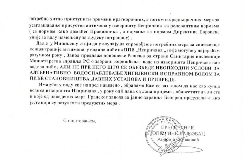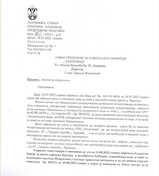 Kako se na društvenim mrežama pojavila uznemirujuća vest o neispravnosti vode za piće, a sve radi umirenja  javnosti i građana, u prilogu objavljujemo Dopis upućen JPKP „Lazarevac“ iz Lazarevca od 18.07.2025.godine, kao i Izveštaj o ispitivanju vode broj 25-02-6263 od 27.11.2025. godine izdat od strane Gradskog zavoda za javno zdravlje Beograd iz koga se nedvosmisleno može utvrditi da je uzorak vode zdravstveno BEZBEDAN.