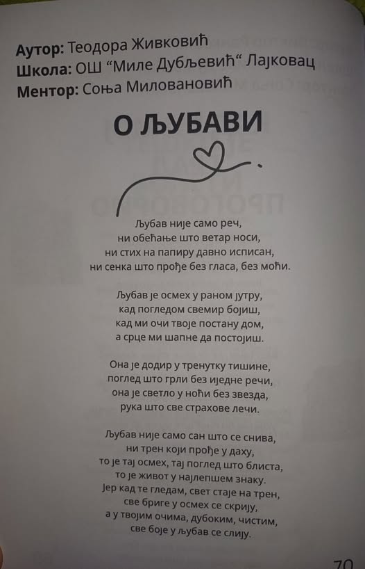 Teodora Živković, učenica 8/3 i članica literarne sekcije „Raspevano pero“ OŠ „Mile Dubljević“ iz Lajkovca, ostvarila je izuzetan uspeh na književnom konkursu „Najbolji mladi pesnici Srbije 2026“.