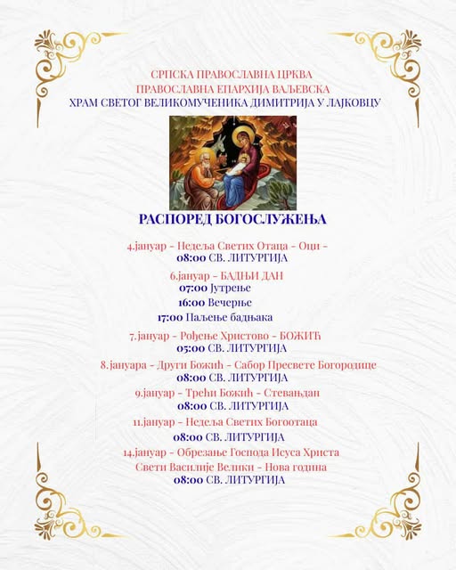 Jutrenje u Hramu Svetog Velikomučenika Dimitrija u Lajkovcu na Badnji dan je od 7 časova.