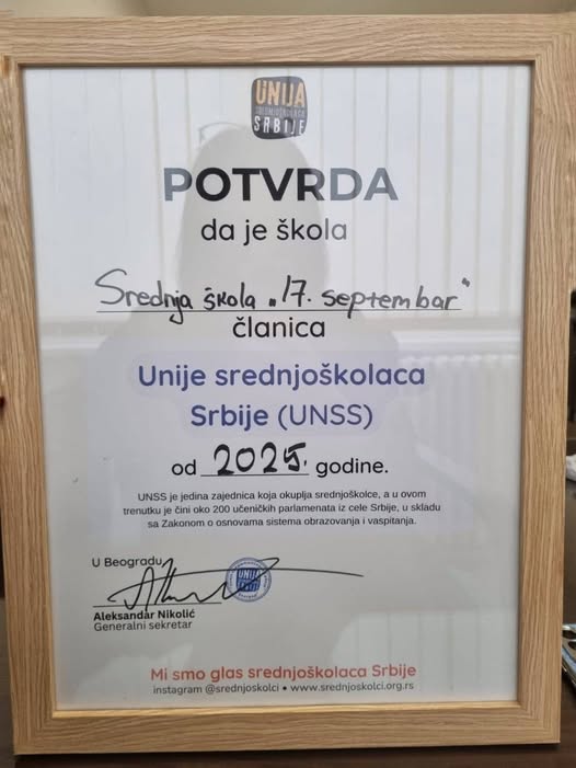 Srednja škola „17. septembar“ Lajkovac, postala je članica Unije srednjoškolaca Srbije (UNSS).