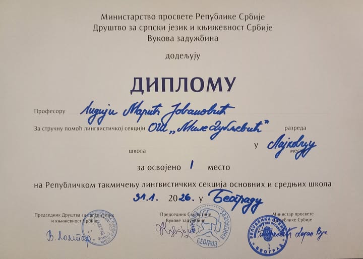 Lingvistička sekcija ,,Čuvari jezika” OŠ „Mile Dubljević” iz Lajkovca pobednik je Republičkog takmičenja lingvističkih sekcija osnovnih i srednjih škola Srbije. Rukovodilac sekcije msr Lidija Marić Jovanović nagrađena je za mentorski rad sa učenicima.