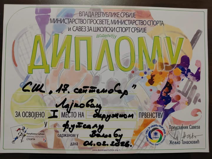 Ekipa Srednje škole „17. septembar“ iz Lajkovca osvojila je prvo mesto na okružnom takmičenju u futsalu, pod vođstvom profesora fizičke kulture Ognjena Nestorovića.
