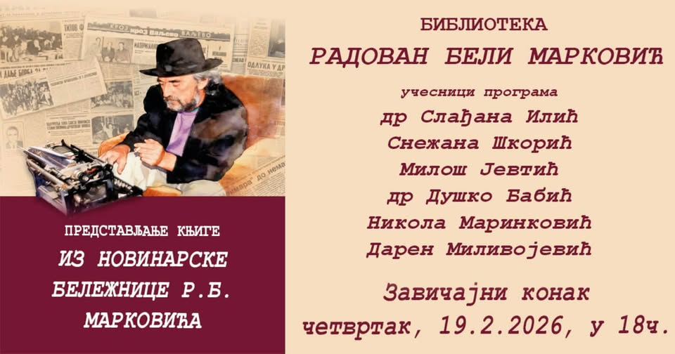 Biblioteka “Radovan Beli Marković”u četvrtak 19. februara od 18 časova, u Zavičajnom konaku organizuje predstavljanje knjige „Iz novinarske beležnice R. B. Markovića”, u izdanju Biblioteke „Radovan Beli Marković” Lajkovac i Srpske književne zadruge, koja je nedavno izašla iz štampe. Učesnici programa biće dr Slađana Ilić, Snežana Škorić, Miloš Jevtić, dr Duško Babić, Nikola Marinković i Daren Milivojević. Delo koje sadrži odabrane tekstove velikog književnika objavljivane u valjevskom nedeljniku „Napred”, po rečima Darena Milivojevića, priređivača, predstavlja pravi spomen na pisca i novinara Radovana Belog Markovića „koji je nadživeo svoje vreme,…