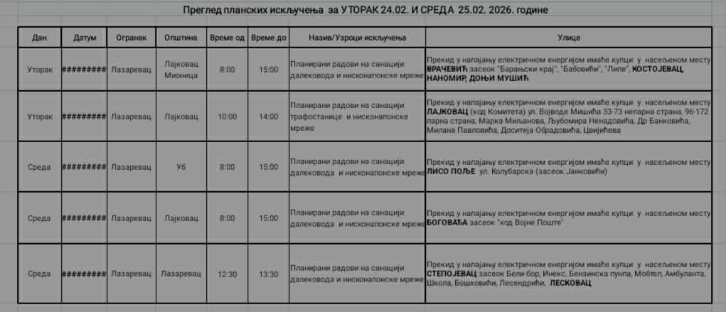 Prema obaveštenju Ogranka Elektrodistribucije Lazarevac, u utorak 24. februara, od 8 do 15 časova, zbog planiranih radova na sanaciji dalekovoda i niskonaponske mreže, prekid u napajanju električnom energijom imaće kupci u naseljenom mestu VRAČEVIĆ zaseok “Baranjski kraj”, “Babovići”, “Lipe”, KOSTOJEVAC, NANOMIR, DONJI MUŠIĆ. U utorak 24. februara, od 10 do 14 časova, zbog planirani radova na sanaciji trafostanice i niskonaponske mreže, prekid u napajanju električnom energijom imaće kupci u naseljenom mestu LAJKOVAC (kod Komiteta) ul. Vojvode Mišića 33-73 neparna strana, 96-172 parna strana, Marka Miljanova, Ljubomira Nenadovića, Dr Bankovića, Milana…