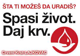 U sredu 25. marta od 9 do 15 časova na platou Pošte Lajkovac, u organizaciji Crvenog krsta Lajkovac i Instituta za transfuziju krvi Srbije, biće ralizovana akcija dobrovoljnog davanja krvi.
