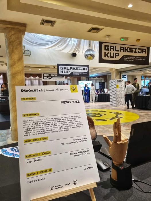 Projekat „NEXUS WAKE“ predstavlja uređaj namenjen povećanju bezbednosti u saobraćaju, koji služi za detektovanje produženog treptaja kod vozača. Sistem funkcioniše tako što putem senzora, koji se nalazi ispod oka, registruje zatvaranje očiju, odnosno žmurenje vozača, i u slučaju da ono traje duže od uobičajenog, aktivira upozorenje. Uređaj se sastoji iz dva dela: senzorskog sistema koji se postavlja oko glave i narukvice koja je sa njim povezana putem Bluetooth veze. Narukvica, nakon detekcije, reaguje vibracijom dok sistem oko glave reaguje zvučnim signalom, sa ciljem da probudi vozača i spreči potencijalnu opasnost.